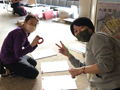 小道具の位置の確認してバミっていく、高橋さんとまいちゃん。